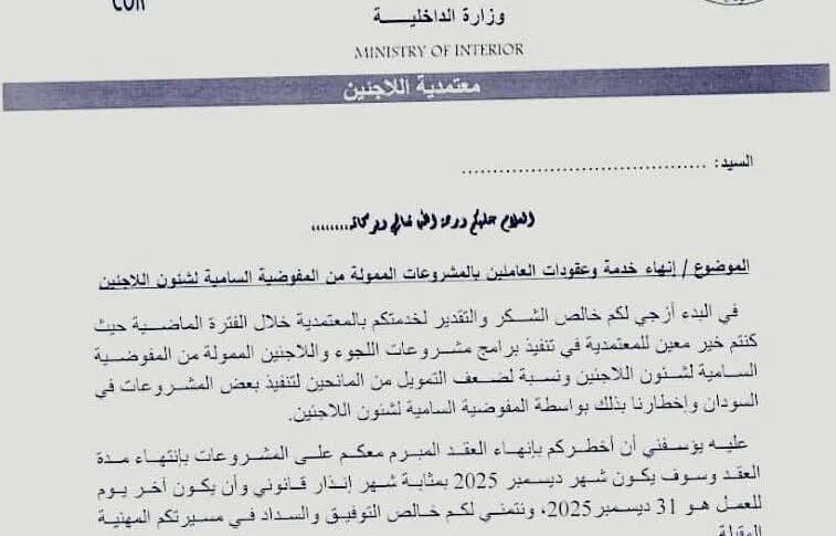 أصدرت معتمدية اللاجئين في السودان،  قرارًا يقضي بالوقف الفوري وإنهاء جميع التعاقدات الخاصة بالعاملين في المشروعات الممولة من المفوضية السامية لشؤون اللاجئين.