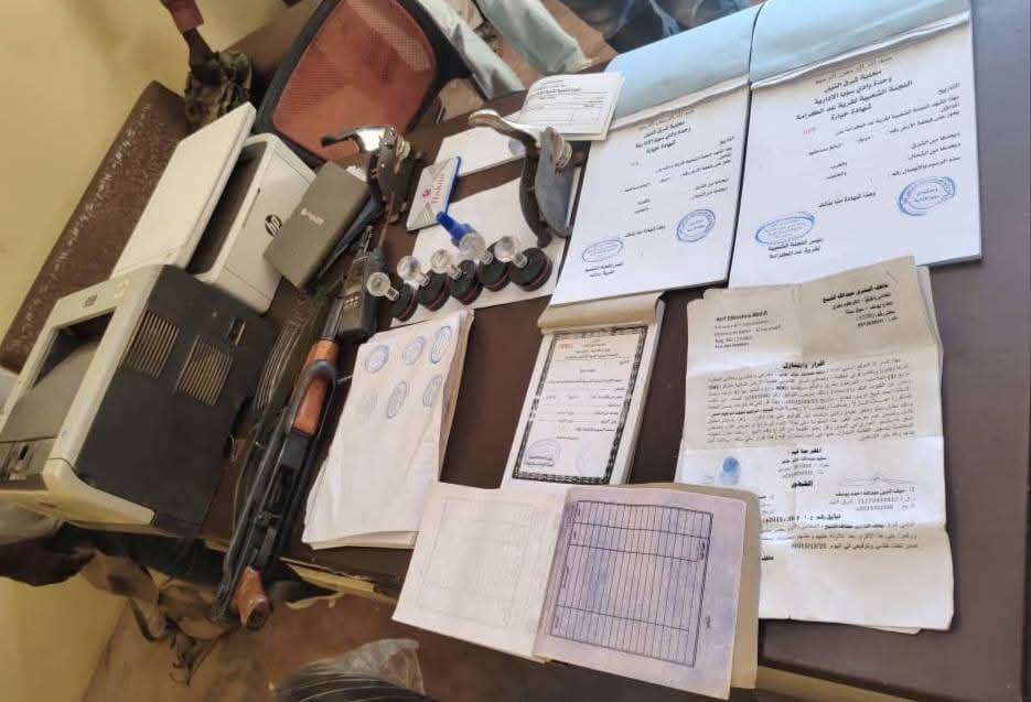 كما تم العثور على خمسة أختام رسمية للوحدة الإدارية بوادي سوبا، إلى جانب دفاتر إيصالات مالية، وجهاز طابعة ليزر، وجهاز ماسح ضوئي (اسكنر)، إضافة إلى ضبط قطعة سلاح من نوع كلاشنكوف وبندقية “جيم 3” استُخدمت في تهديد ونهب الضحايا.