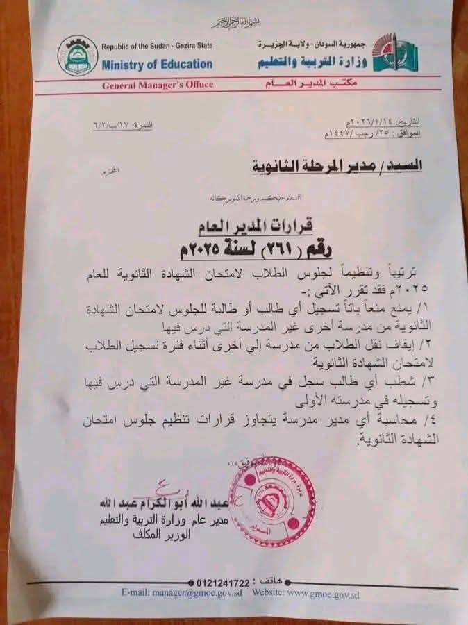 ويأتي القرار في إطار تنظيم عملية التسجيل والحد من المخالفات، وضمان استقرار العملية التعليمية وسلامة الإجراءات الإدارية المرتبطة بامتحانات الشهادة السودانية.