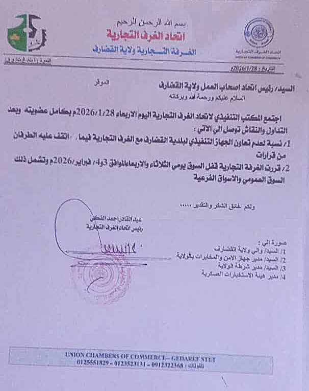 وأشار الخطاب إلى أن الغرفة التجارية أرسلت نسخًا من القرار إلى والي ولاية القضارف وأعضاء اللجنة الأمنية بالولاية، لوضعهم في صورة الموقف وتداعياته
