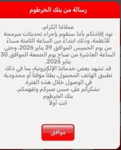 أعلن بنك الخرطوم عن تنفيذ تحديثات مبرمجة على أنظمته التقنية، تبدأ اعتبارًا من الساعة الثامنة مساء اليوم الخميس 29 يناير، وتستمر حتى الساعة العاشرة من صباح يوم الجمعة 30 يناير.