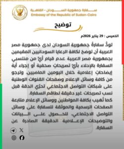 نفت سفارة جمهورية السودان لدى جمهورية مصر العربية، بشكل قاطع، صدور أي تصريحات صحفية أو إيضاحات إعلامية عن أي منسوبيها خلال اليومين الماضيين، مؤكدة أن ما تم تداوله في هذا الشأن عارٍ تمامًا من الصحة ولا يمت للحقيقة بصلة.