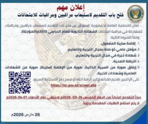 أعلنت قنصلية السودان في مدينة جدة فتح باب التقديم لاستيعاب مراقبين ومراقبات للمشاركة في مراقبة امتحانات الشهادة الثانوية السودانية للعام الدراسي 2025″ (المؤجلة).