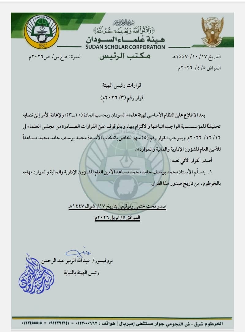 أصدرت هيئة علماء السودان قرارًا رسميًا بتاريخ 17 شوال 1447هـ الموافق 5 أبريل 2026م، وذلك استنادًا إلى النظام الأساسي للهيئة، لا سيما المادة (10-3)، وحرصًا على تعزيز العمل المؤسسي والالتزام باللوائح المنظمة.